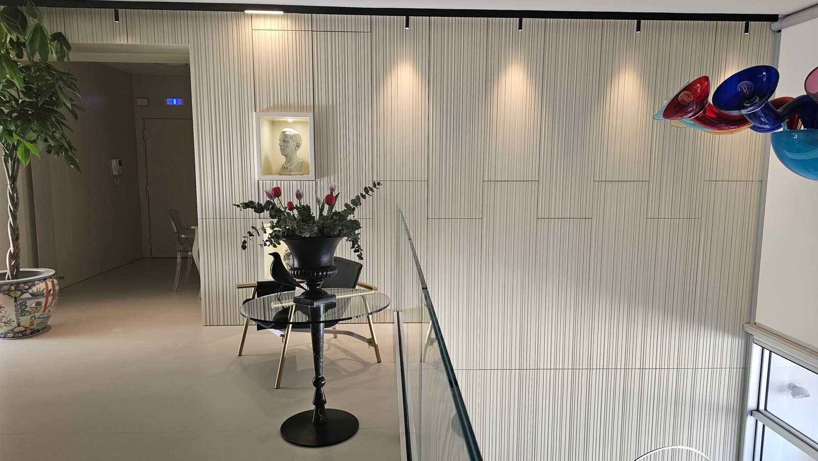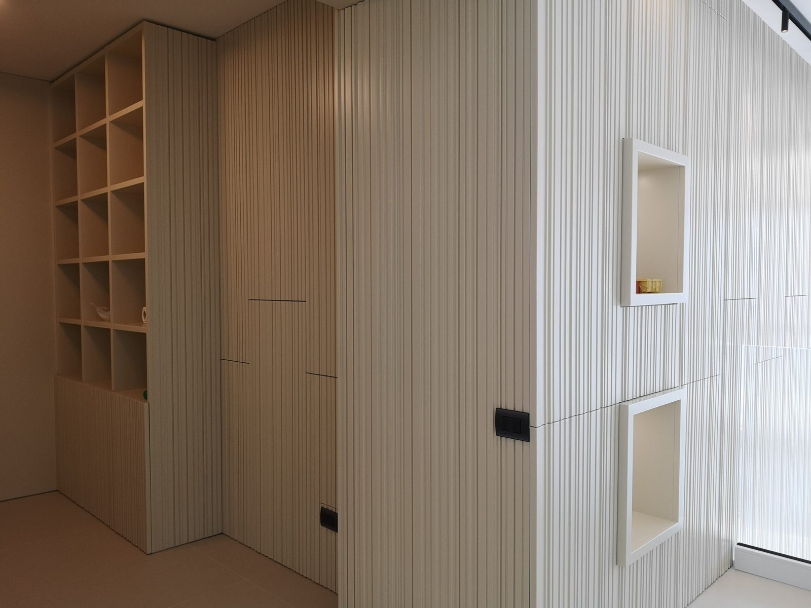 LA COMPOSIZIONE È SVILUPPATA CON PANNELLI VERTICALI. CONTENITORI AD INCASSO, E SUPERFICI PROGETTATE SU MISURA PER INSERIRSI ARMONIOSAMENTE NELLA PARETE. OGNI ELEMENTO È STUDIATO PER UNIRE RESA ESTETICA E PRATICITÀ NELL’USO QUOTIDIANO.
